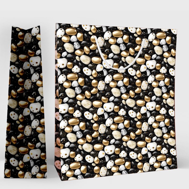 Inspired by the natural beauty of polished stones, this elegant gift bag showcases a decorative pattern in gold, white, and black tones. The glossy pebble-like design adds a modern yet organic feel, making it perfect for refined celebrations and stylish gifting.